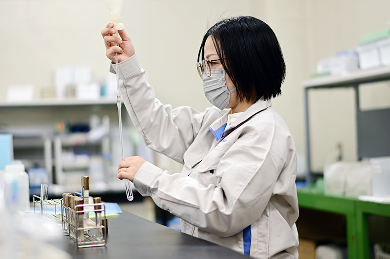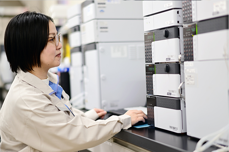 試験課において医薬品の製品試験を担当しています。製品試験には医薬品の品質を確認するため多くの試験を行いますが、主な試験として医薬品行政から承認された内容に従った定量試験、確認試験および純度試験などがあります。これらの試験を行うにあたり、医薬品工場で必要なGMP(医薬品の製造管理および品質管理に関する基準)という法令を遵守する必要があり、この法令に基づいた試験手順書および試験記録などを作成する必要があります。また、試験実施計画の策定、試験担当者の配置およびパソコンを使用した試験結果解析などの他、GMPの教育訓練および試験環境の整備なども行っています。